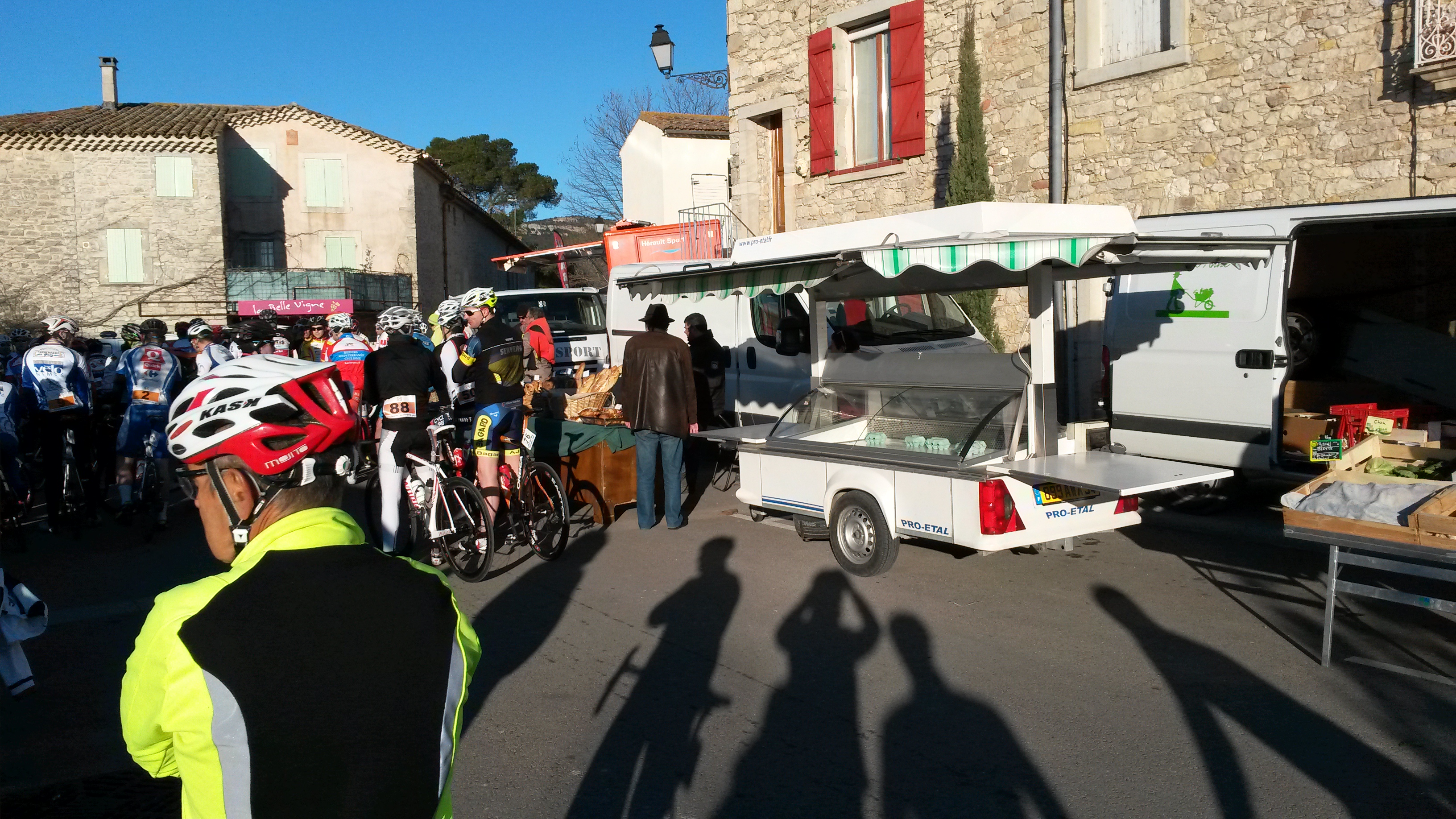 A while back John thought it might be a nice idea to do a little race in one of our backyards (Pic Saint Loup). He signed up, then I signed up, then we realized what we’d signed up for. The Tour de l’Hortus (still happening as I write this – there’s a TT that we skipped in the pm) is a sanctioned race (yes, race without the ” “) by one of the French sport federations (FSGT) and would be full of guys and girls who are categorized riders hungry for points…or something.