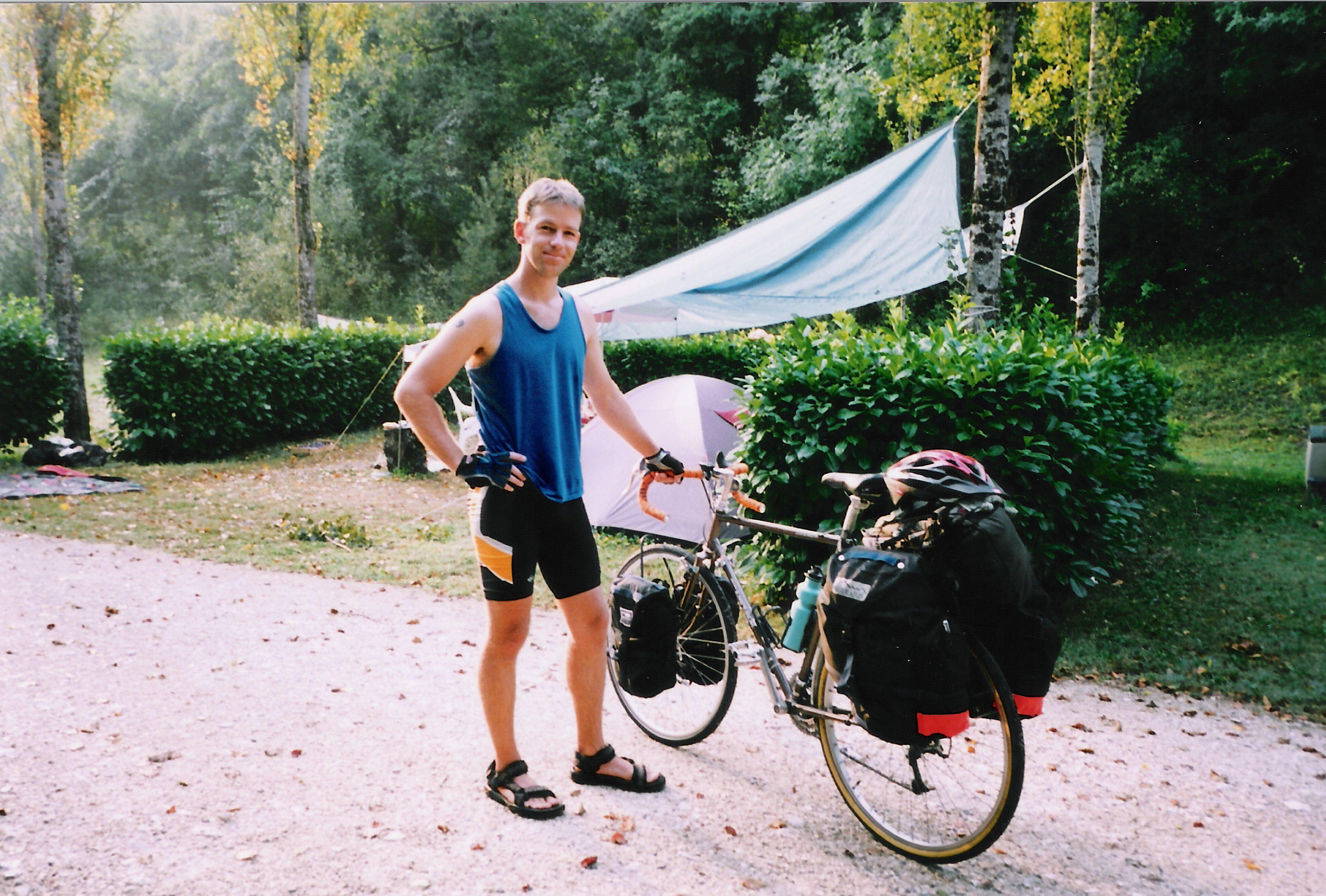 My wanderlust was on EPO when I lived in Vancouver and I couldn’t wait to leave, after making the decision to quit everything and travel to Asia. Once I had enough money to do that I was gone and suddenly my horizons exploded. I landed in Australia along the way, and in 1996 I bought a used mountain bike in Adelaide and cycled across the country, all by my lonesome. There it is below, loaded up with 3 huge water bottles (4 more liters in a bladder on the back rack), back panniers filled with clothes, a tent and cooking gear, with my sleeping bag strapped to my handlebars. To top it off, I put tri bars on a mountain bike. Function over form in those days.
