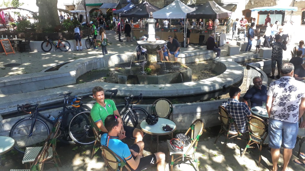 There were lots of things to take photos of today, like the hundreds of cyclists we passed (I lived here 10 years ago and it was nothing like what we saw today), the majestic Pic St. Loup itself, or close-ups of John’s equally impressive moustache. But a village coffee stop is what you get (although if you can enlarge the pic you might get a good look at that ‘stache).