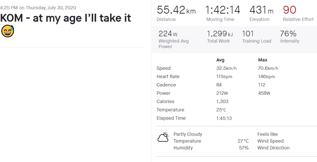 Then the other day I got an email from a guy I know back home who got a rare KOM on a segment he rides all the time. Well, what really happened was that he got 2nd place by one second on the Leaderboard one day, not even knowing there was a segment there, then going back a day or two later to grab the KOM. He confirmed that it hurt a lot.