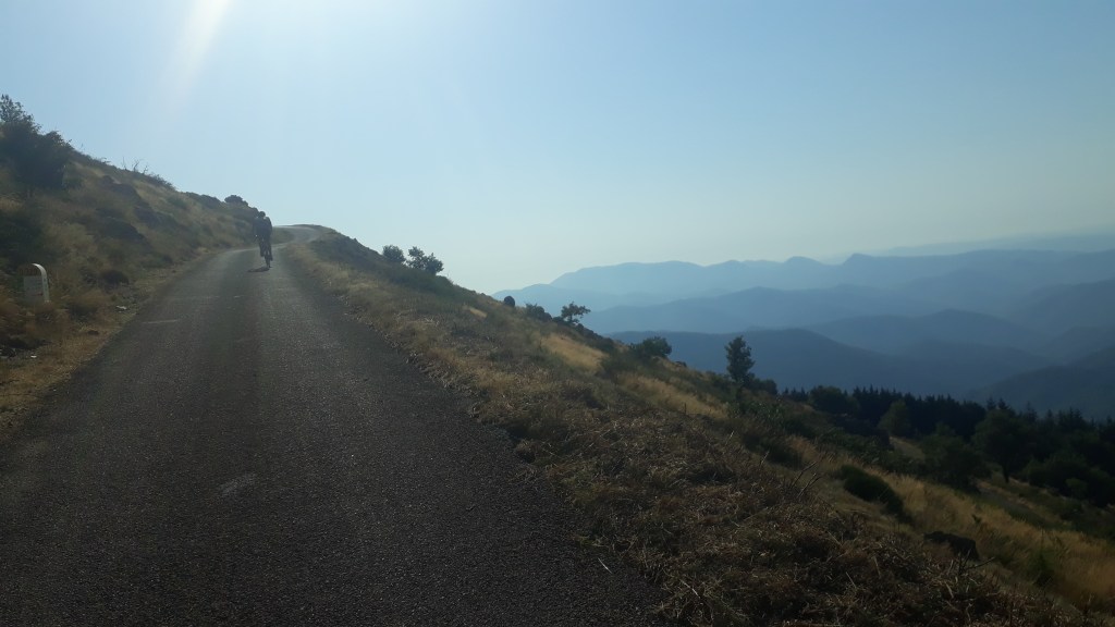 The whole last climb today from Le Vigan is 35 km long, with a little downhill between the top of the Lusette and the last easy climb to the summit of Mont Aigoual. I’m hoping that after yesterday’s freewheel to Pirvas the peloton will grace us with a little racing.
