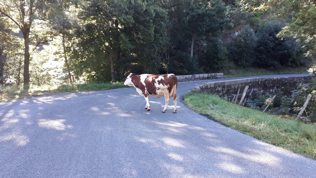 But none of these animals ever gave me much grief, like the cow below is giving the cyclist below. I hope this is photoshopped!