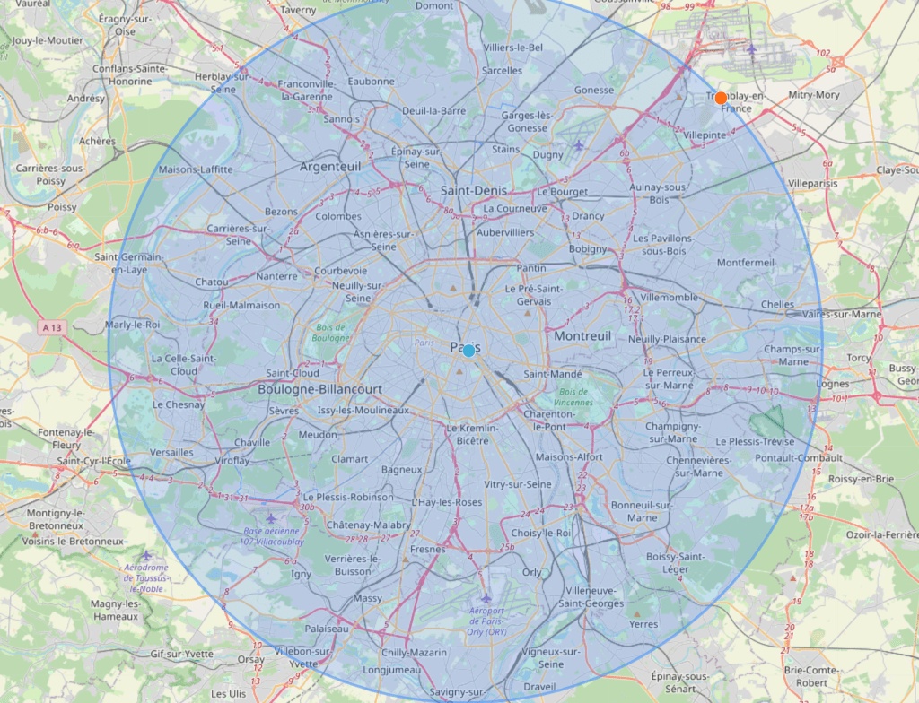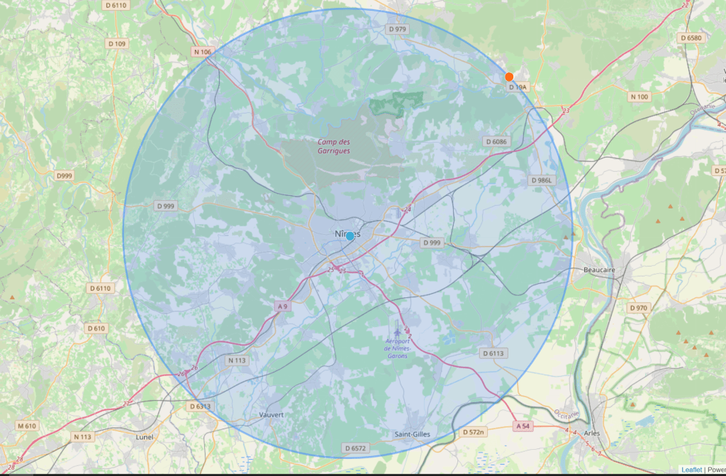 The 20 km radius from Nimes above is where I do most of my riding, unless it’s more than 3 hours. There is lots of great riding in this area, as you can see from the lack of ‘grey’ on the map. I had a discussion with my friends in Paris last night about their 20 km and they were not jumping for joy. Here it is.