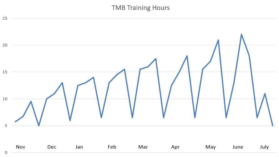 • Each block up there is 4 weeks: 3 weeks of (usually) increased hours/mileage and 1 week recovery.