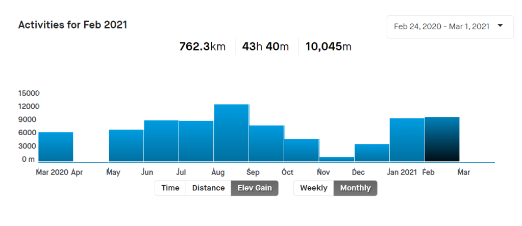 February: 44 hours on the bike. 10,000 meters of ascent. There were a lot of indoor rides.