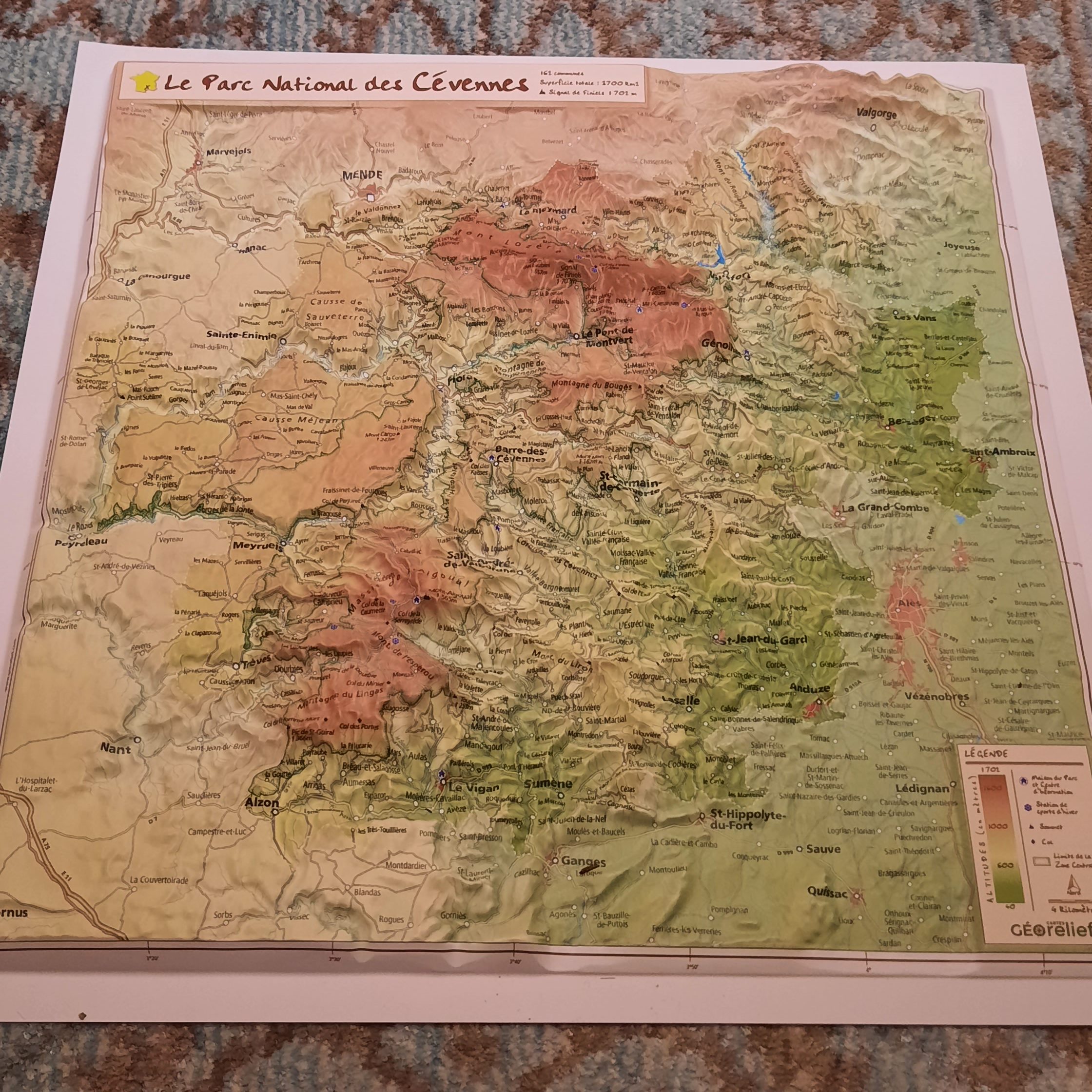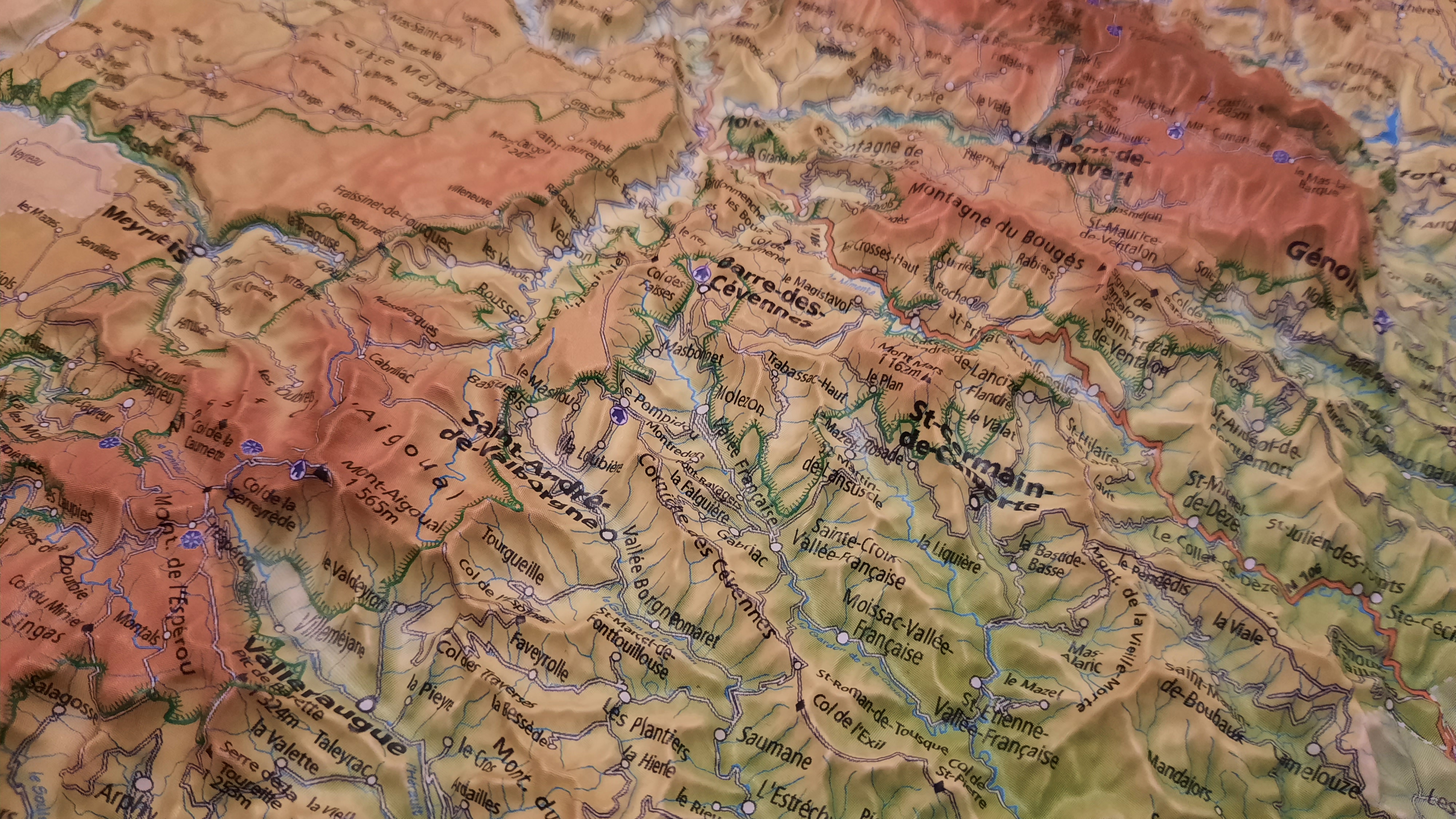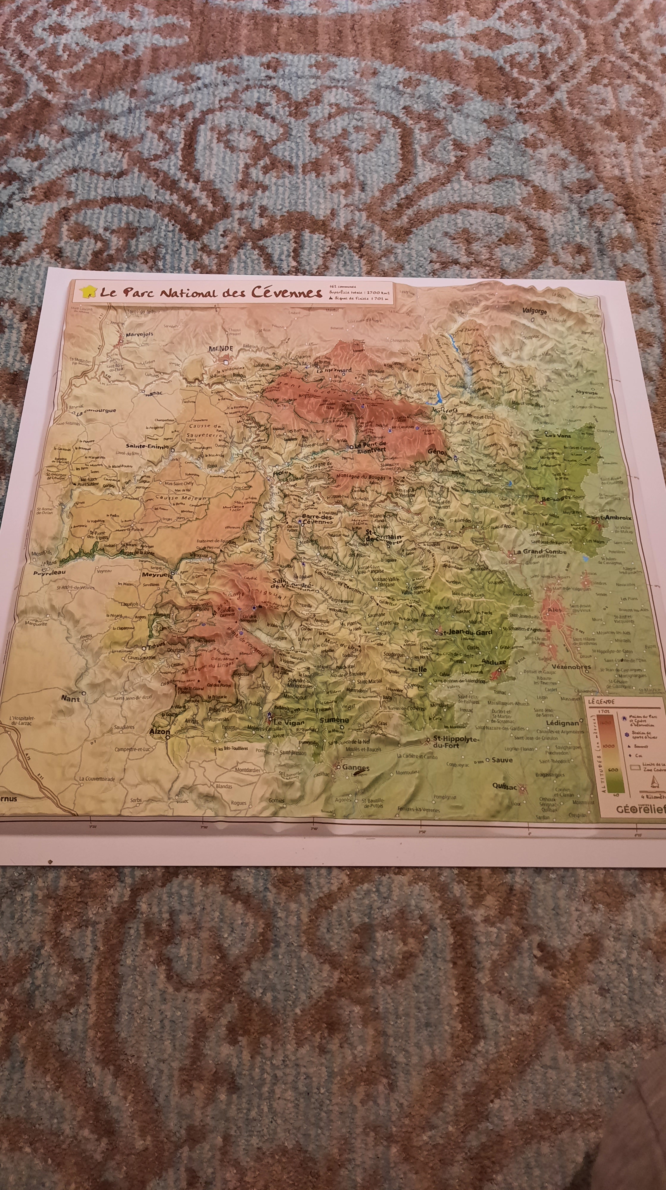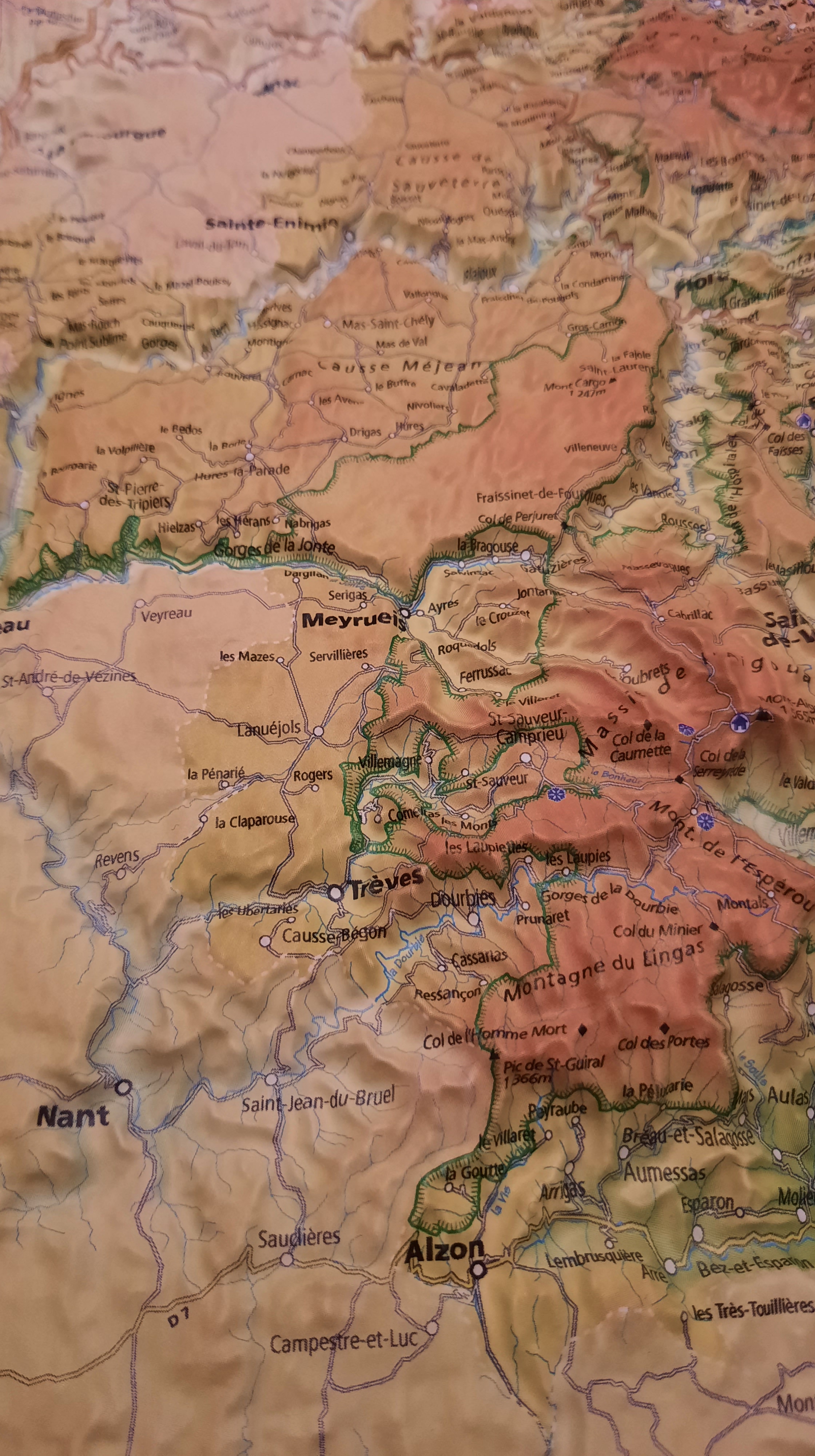 This is a relief map of the Cévennes that has actual relief, instead of just colors and shading. I’m sure there’s a name for this sort of thing, so feel free to educate me. You can see the 3 distinct geographical areas of the mountains quite nicely here: