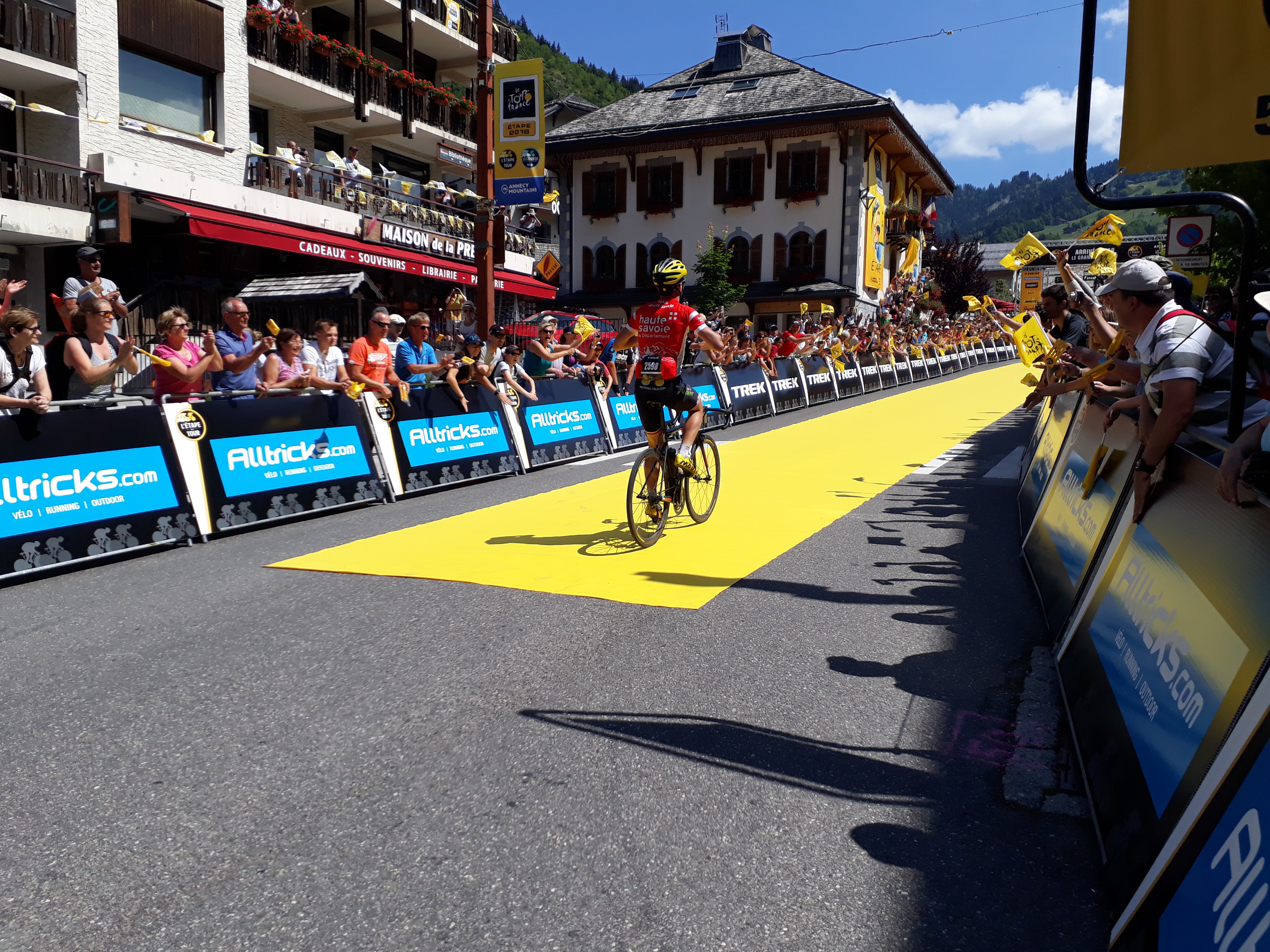 And so it was during the 2018 Etape that finished in Le Grand Bornand. We found parking spots for the vans, set up our flags, got the know the village very well, and then went to the finish line to wait for the winner to roll in. Here he is.