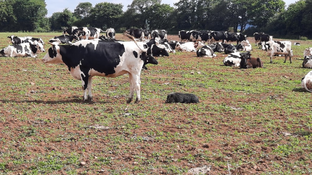 3. Lovely pictures. I’d say the pig eats something that the farmer would rather the cows didn’t. Here, farmers used to put a goat in with cows to eat Benweeds that either made the cow sick or tainted the taste of the milk.