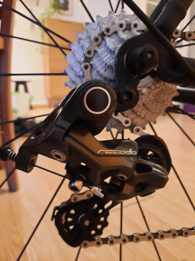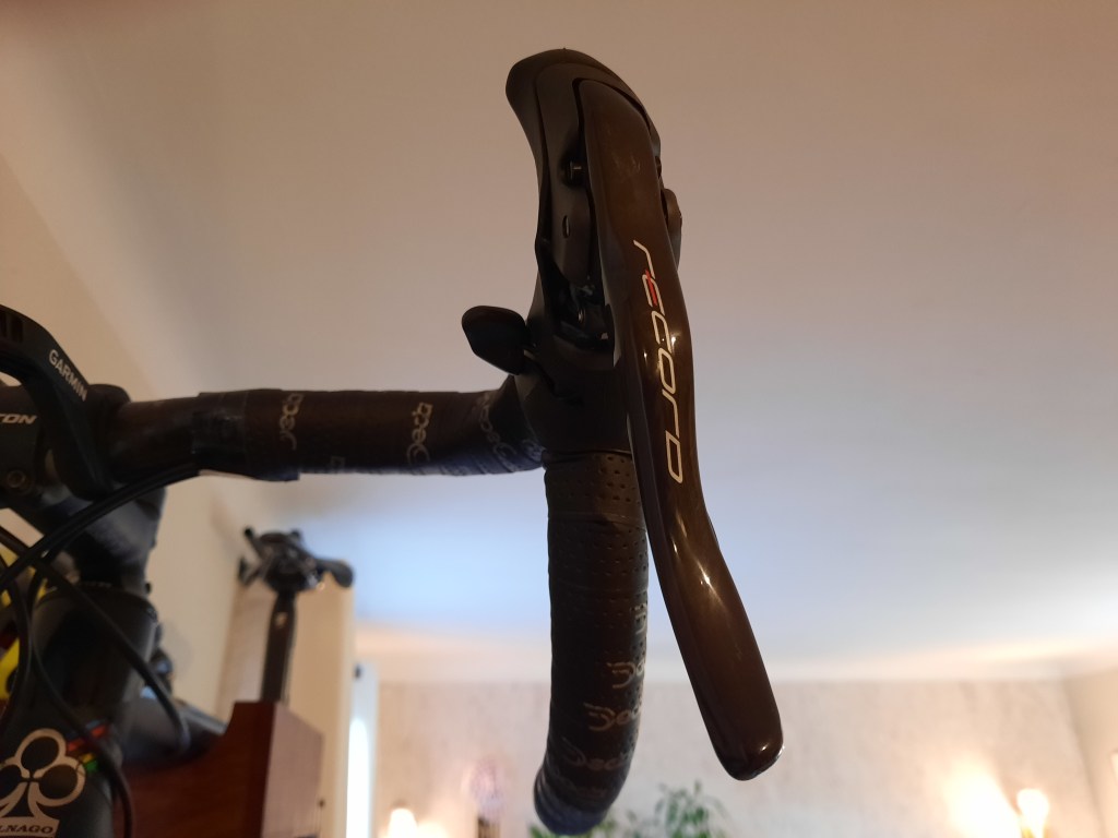 I outfitted my C59 with a Chorus gruppo way back in 2015, which was mostly a financial decision, having burned my budget on the frame set. Since then, though, I’ve always felt like the bike ‘deserved’ at least Record. I even have a client who has commented several times on my “Record”, just assuming that I would have it. Well Rich, now I do! The Colnago now sports a 12-speed transmission (same range as before – 11-29) and I can convince myself that I have a new bike. I got my shop to put the old Chorus on the Bianchi, which had an even older version of that groupset on it. Upgrades all around.