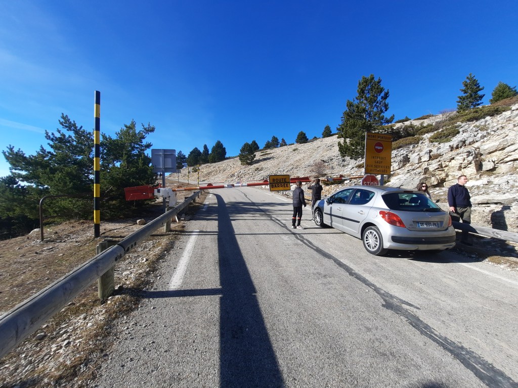 I didn’t actually know if the mountain was climbable today, but I had no plans and wasn’t even hung over, so I drove through the fog to Bedoin and slooowly pedalled up the mountain. When I reached the barrier, a couple of km after Chalet Reynard, things were looking promising. I even got those boys there to open it for me so I wouldn’t need to duck under.