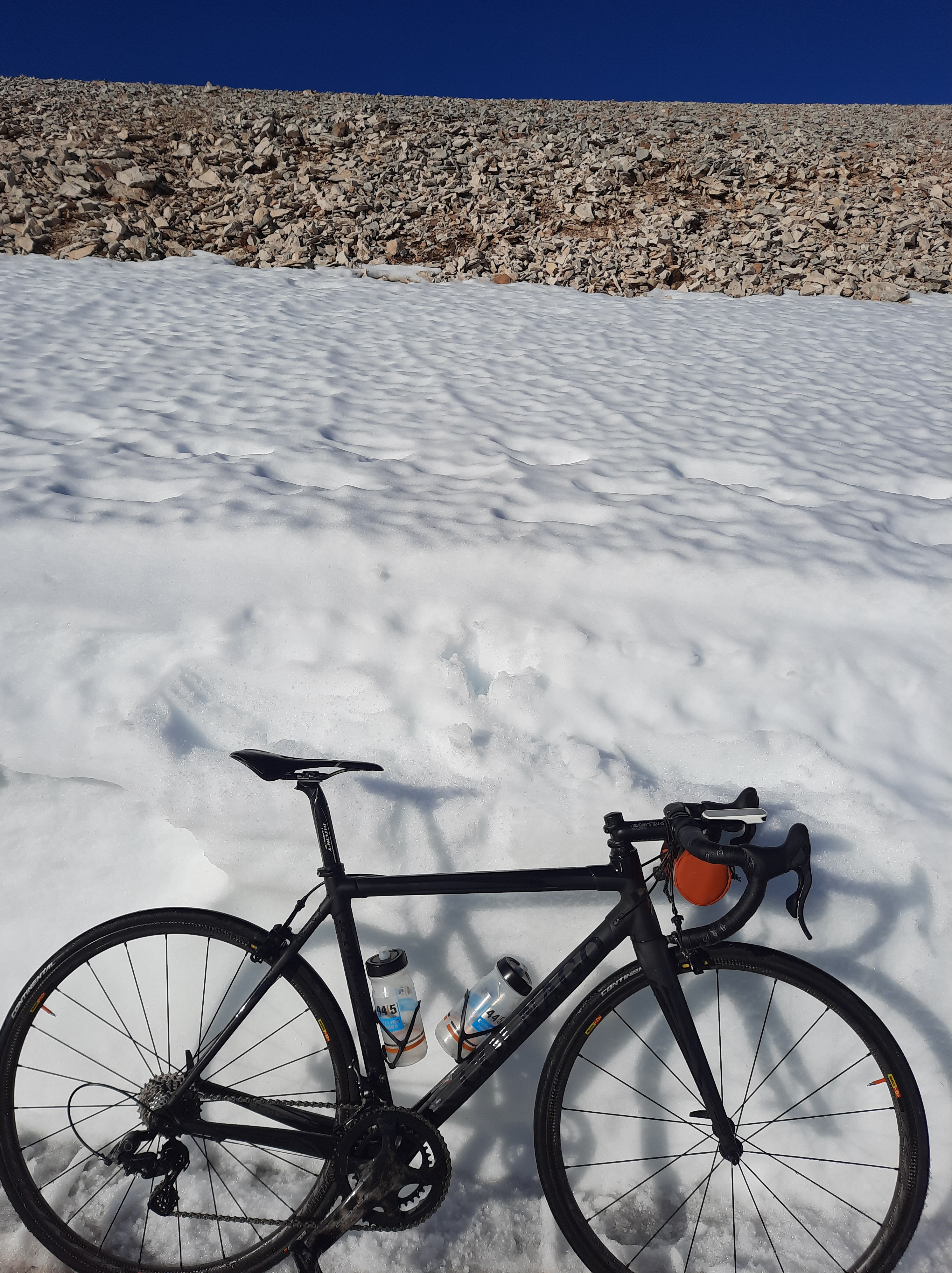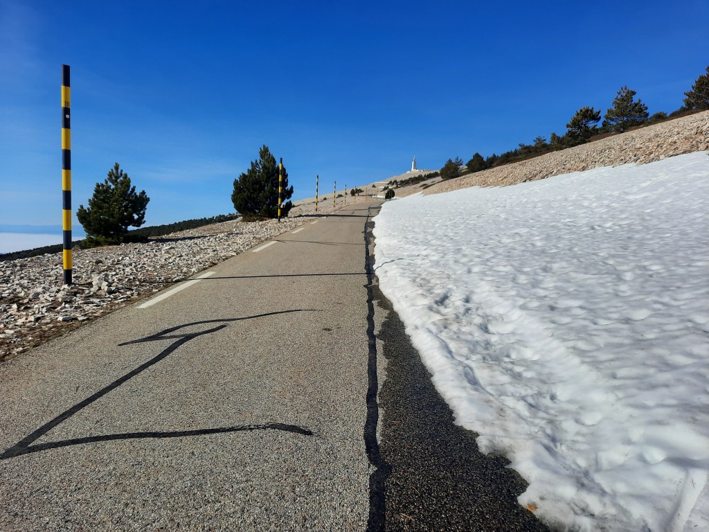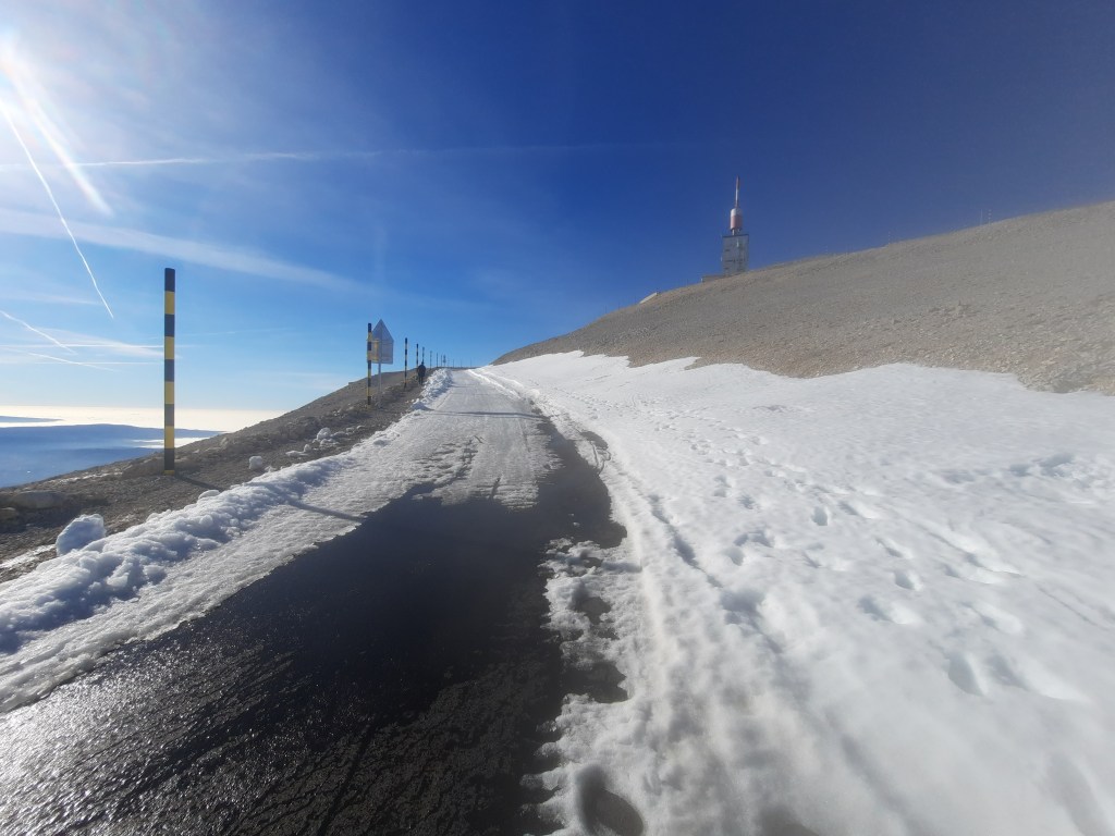 If you’ve ever climbed Mont Ventoux you’ll remember the series of huge ins and outs that you do between Chalet Reynard and the top. There was no snow on the ‘ins’, but it collected in banks on the ‘outs’. I had to get off the bike a few times to practice my ‘cross skills.