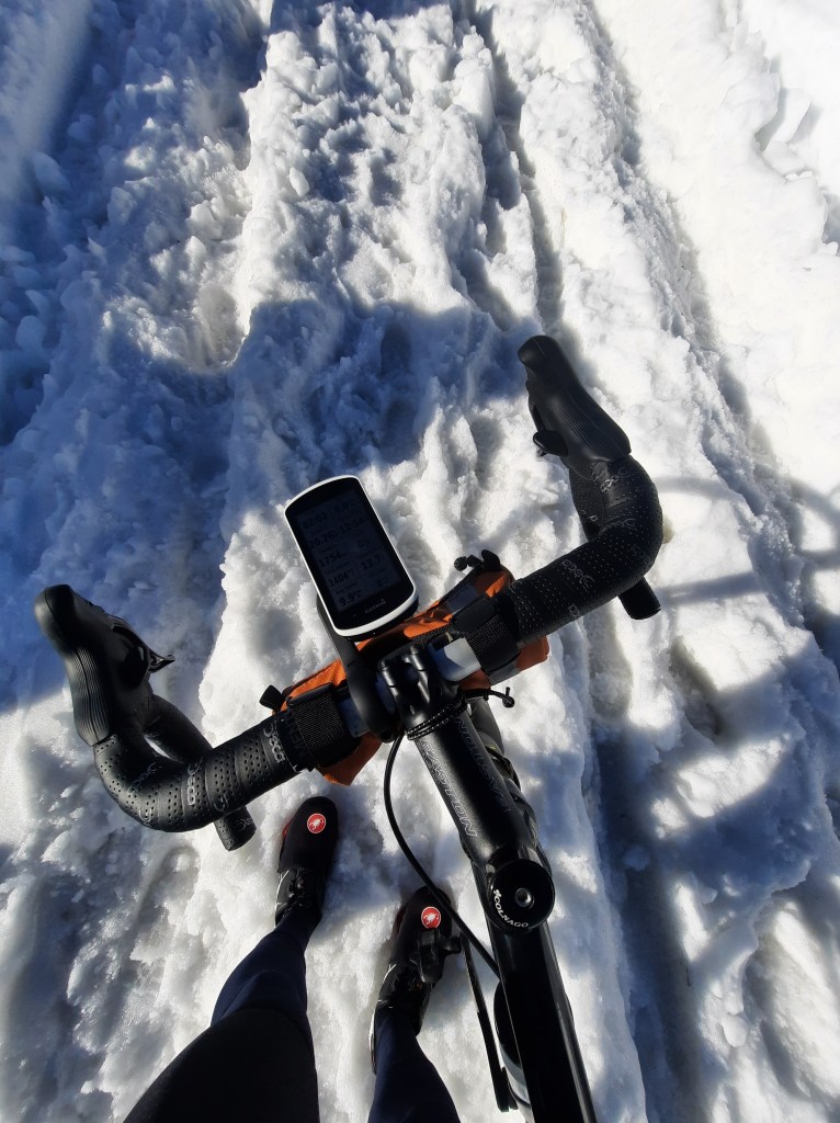 When I stopped at the place the last photo was taken I thought I’d just turn around. I didn’t really see the point in walking the last 400 meters and my feet were getting soaked. Then 3 men walked by and, seeing that I was turning around, one of them said to me ‘in life you need to make a little effort’. I had just climbed 1500 meters straight up, but saw their point and trudged on. Luckily the snow ended a hundred meters or so up the road and I could (after pounding the ice out of my cleats) finish in style…or at least on my bike.