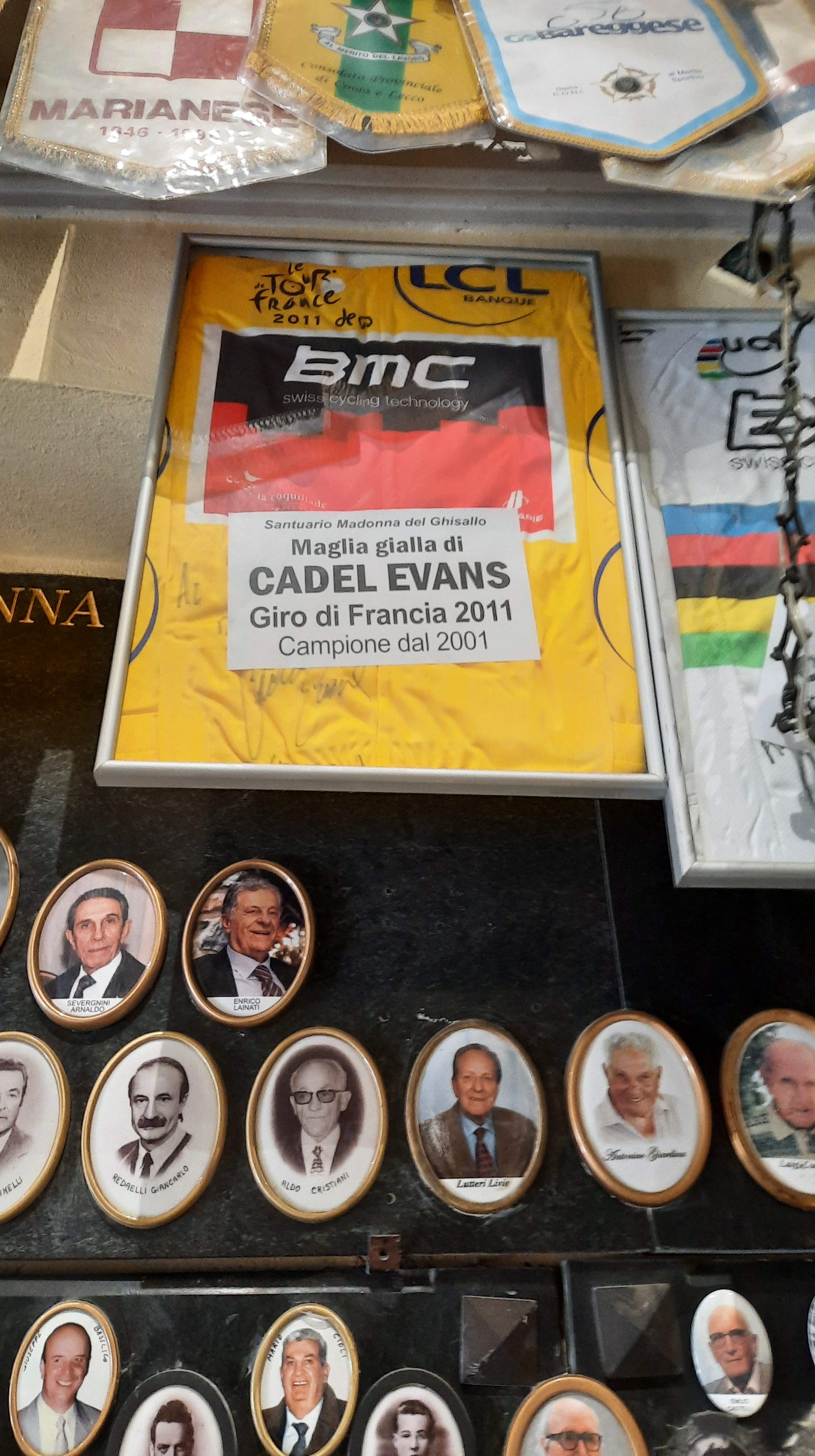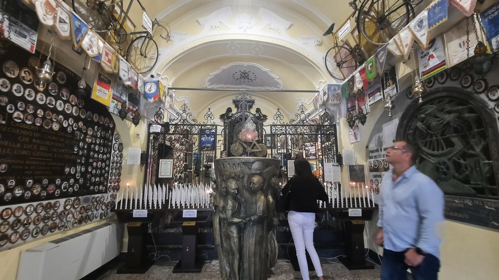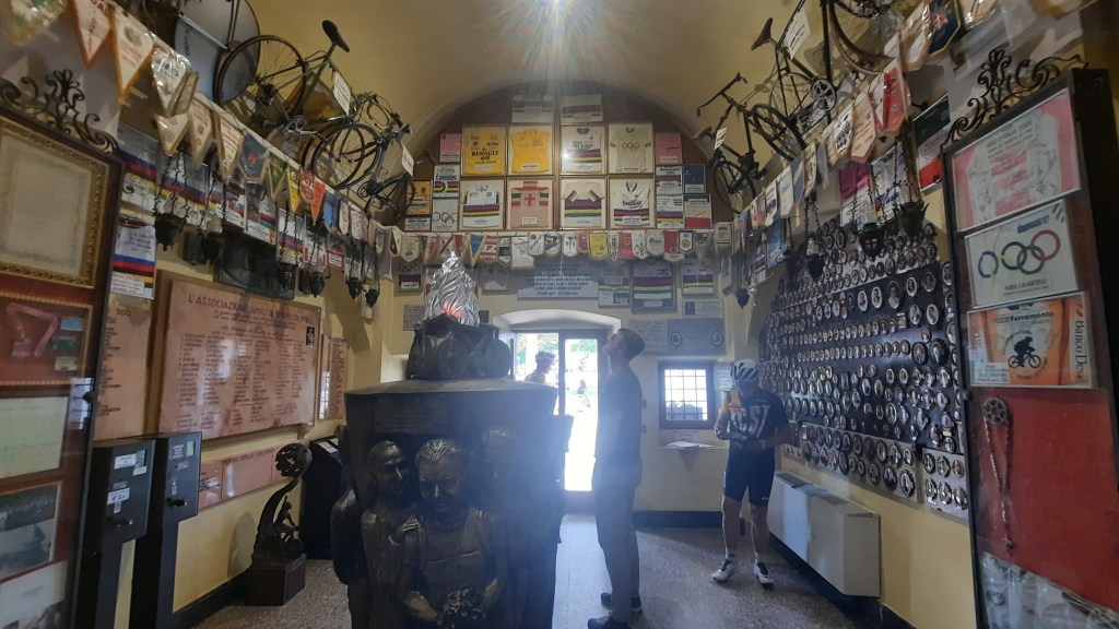 The chapel is on a short passo that overlooks Lake Como and some stunning mountains to the north. It is jammed packed with historic memorabilia, including bikes and jerseys from great Italian riders, plus a few who Italy has a soft spot for.