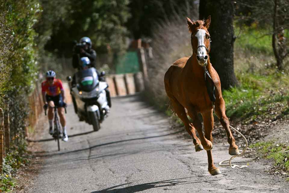 I’ve seen and heard this word twice in two days of racing, so it must be important: La Pagaille. In the two cases below, it translates to ‘mayhem’ or ‘havoc’. First, this horse who found itself racing Demi Vollering for the win in Strade Bianche yesterday.