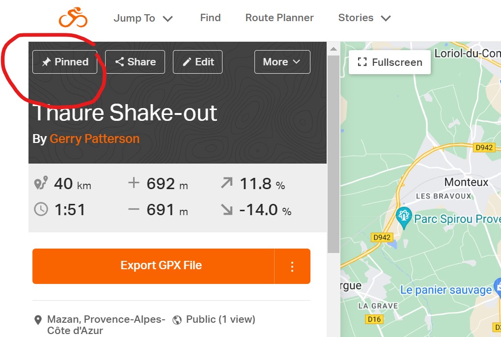 First, you need to have RWGPS synced with Garmin Connect, which I had already, amazingly. Then, after creating or uploading a route on RWGPS, just ‘pin’ it at the top left of your screen.