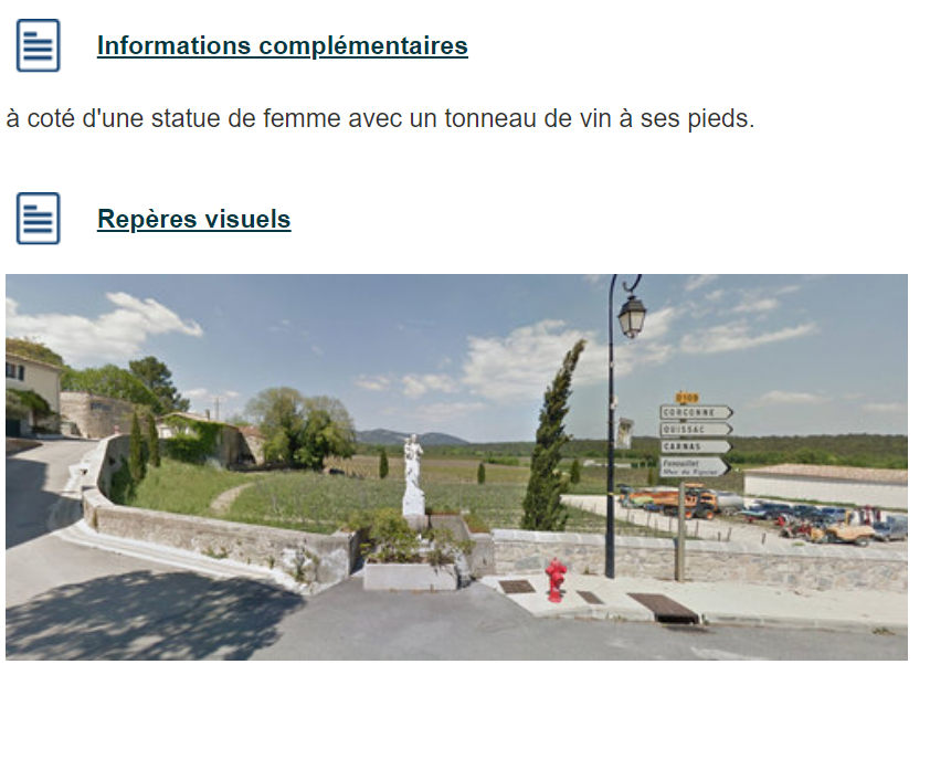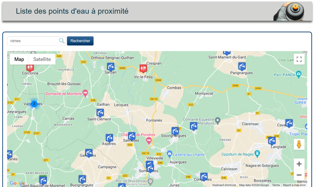 When it’s time to drink, just open your phone and see if you are near one of the icons above. To find out where the ‘point d’eau’ is, click, then you get handy information like this: