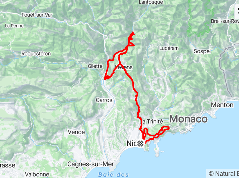 A couple of days ago I made my way east to Nice, which is never a bad idea, even without an objective. I had one, though – I was looking to find a decent way to enter the city from the north that wouldn’t be too mountainous. This finale will be at the end of a hard 190km day from Cuneo, Italy, and that day will be at the end of a challenging 8-day custom tour I’m making for my step-brother Rob and friends. I did my best.