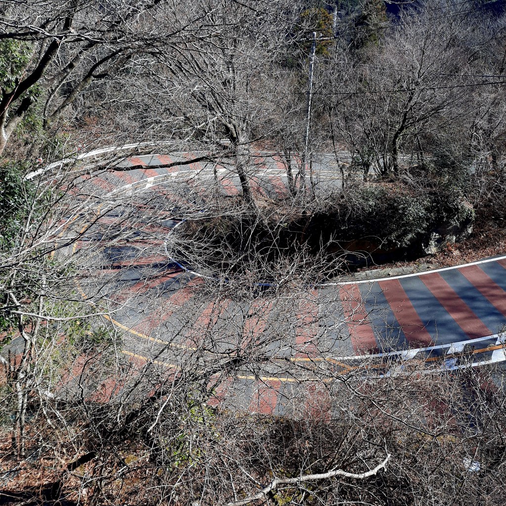 The way back down the mountain was much better, on the Old Tokaido Road. The crazy-tight switchbacks near the top were the highlight (below left). As for Fuji views, I didn’t realize that my climb took me up a ridge that offered none at all. Below is the best I could do, about 3 kilometers from home at the end of the ride.