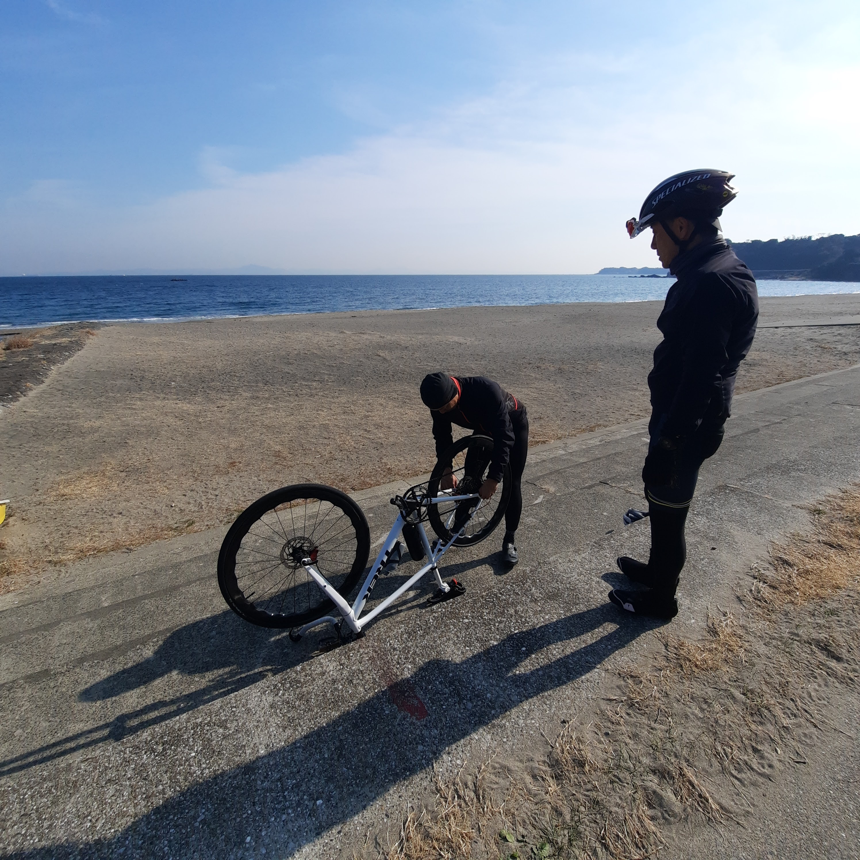When we got past the daikon (radish) fields and hit the south side of the peninsula, Yukio decided to run over a giant nail and I got to watch my first Japanese tube change. Other than the fact that he didn’t use a tire lever, it was very similar to what I’ve witnessed in France. And as you can see, there is always a trusty supervisor (Kazuyoshi in this instance), ready to offer help, or at least helpful advice.