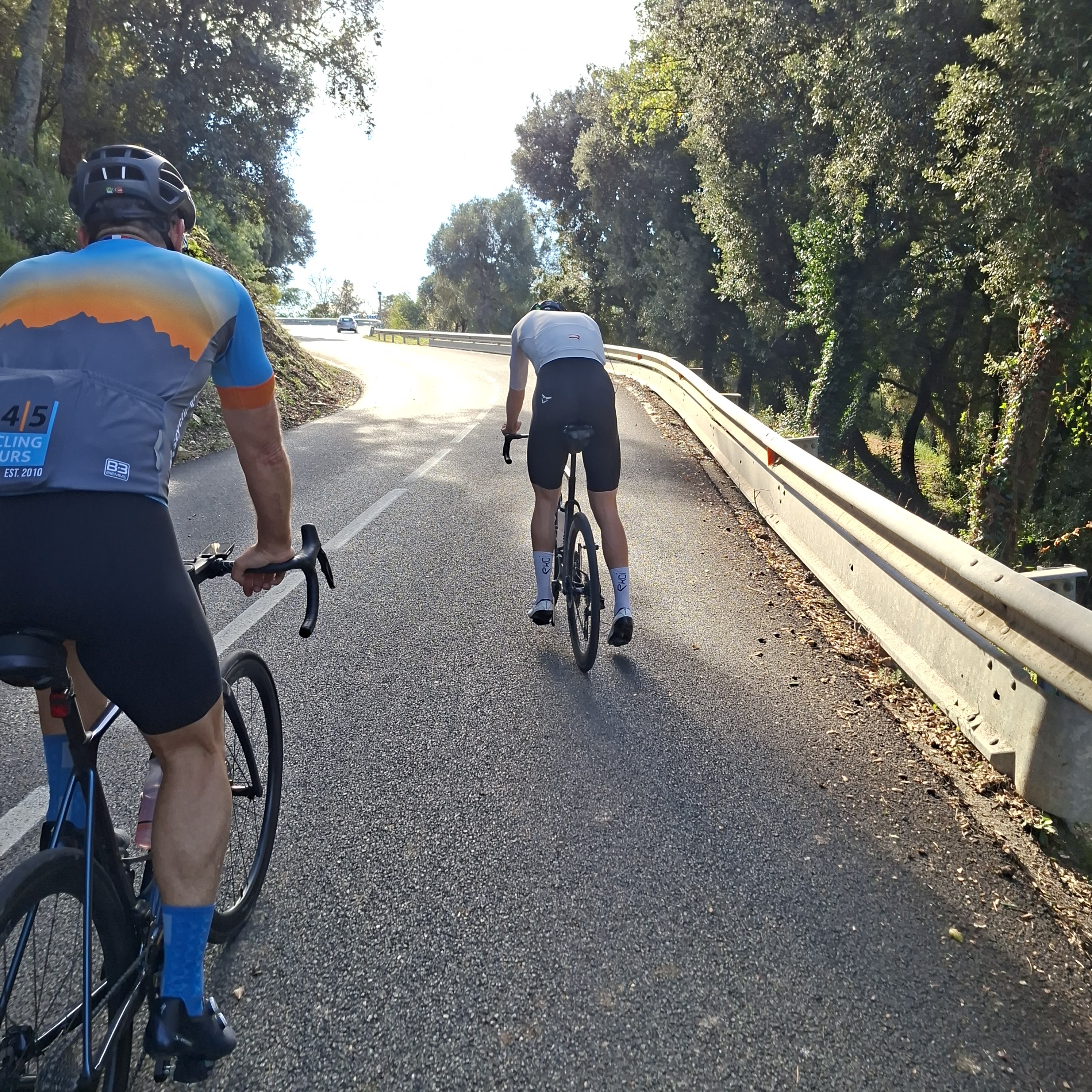Below is a guy who blasted past us up the hill a few minutes before the pic was taken, doing an all-out effort before deciding the climb Els Angels with one leg. We barely passed him using all the legs we had. We were sure he was a pro, but were confounded by his lack of team kit. Sure enough, Viggo Moore is between teams at the moment (leaving IPT to Ineos). He was in the development team at Premier Tech and presumably training hard to make Ineos’ main team.