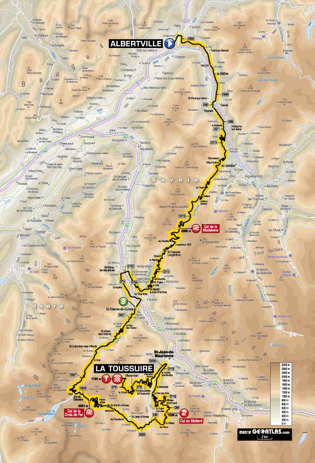 Act One is, as the French translation says, ‘dense’ with mountains; similar to Act 1 in 2011, but longer and with more climbing. It is a relatively short stage, at 140 km, but will cross 4 Alpine passes (Madeleine, GlandonCroix de Fer, Mollard) before a mountain finish at the ski resort of La Toussuire-Les Sybelles.