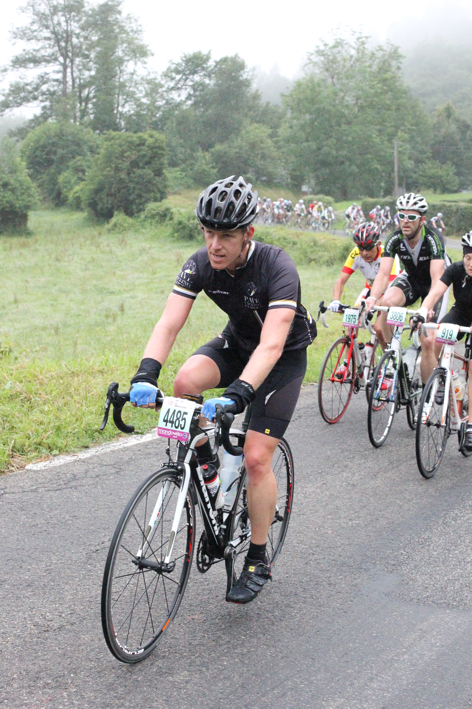 I really felt dynamite most of the day on Saturday and one reason might have been the result of the principle of overcompensation, where you push your body so hard in one (or several) go that the organism not only rebounds to its previous condition, but overcompensates for the abuse you gave it by peaking even higher. I have no idea if the timing was correct for this ‘peak’ (the Etapes were 6 days apart), but as I said already, I had energy from beginning to end this race and I’m guessing that the previous race had something to do with it. Here’s my only in-race photo, taken by a pro. He was kind enough to Photoshop a bunch of guys behind me to make it look like I’m leading a giant peloton.