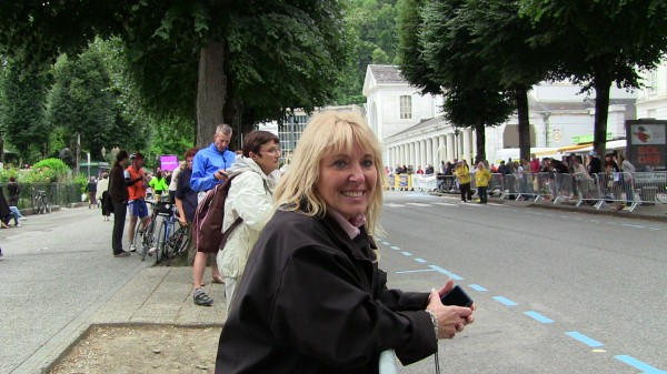 Then, a few km from the finish, I heard a woman say a number – seven hundred something – then she said another one, just higher, right after. I looked at the guy next to me and asked if I’d heard correctly. He said, ‘oui, pas mal, eh?‘. This wonderful woman was standing on this bend in the road, counting off each rider’s placing and announcing it to them! I thought she was probably ‘not quite there’, especially since the number she was quoting was all wrong. I was sure my result would be worse than last year (around 2000) by the way I was feeling. Still, it gave me hope and I found some energy to get to the last km, which was far less steep, then, just like the Alpe last year, there was the long false flat that led to the finish line. I gunned it, crossing the line (hand in hand, I might add!) with a guy I’d sort of been riding with all day long – a Spaniard I think – and fell into the waiting arms of Anne and Erik.
