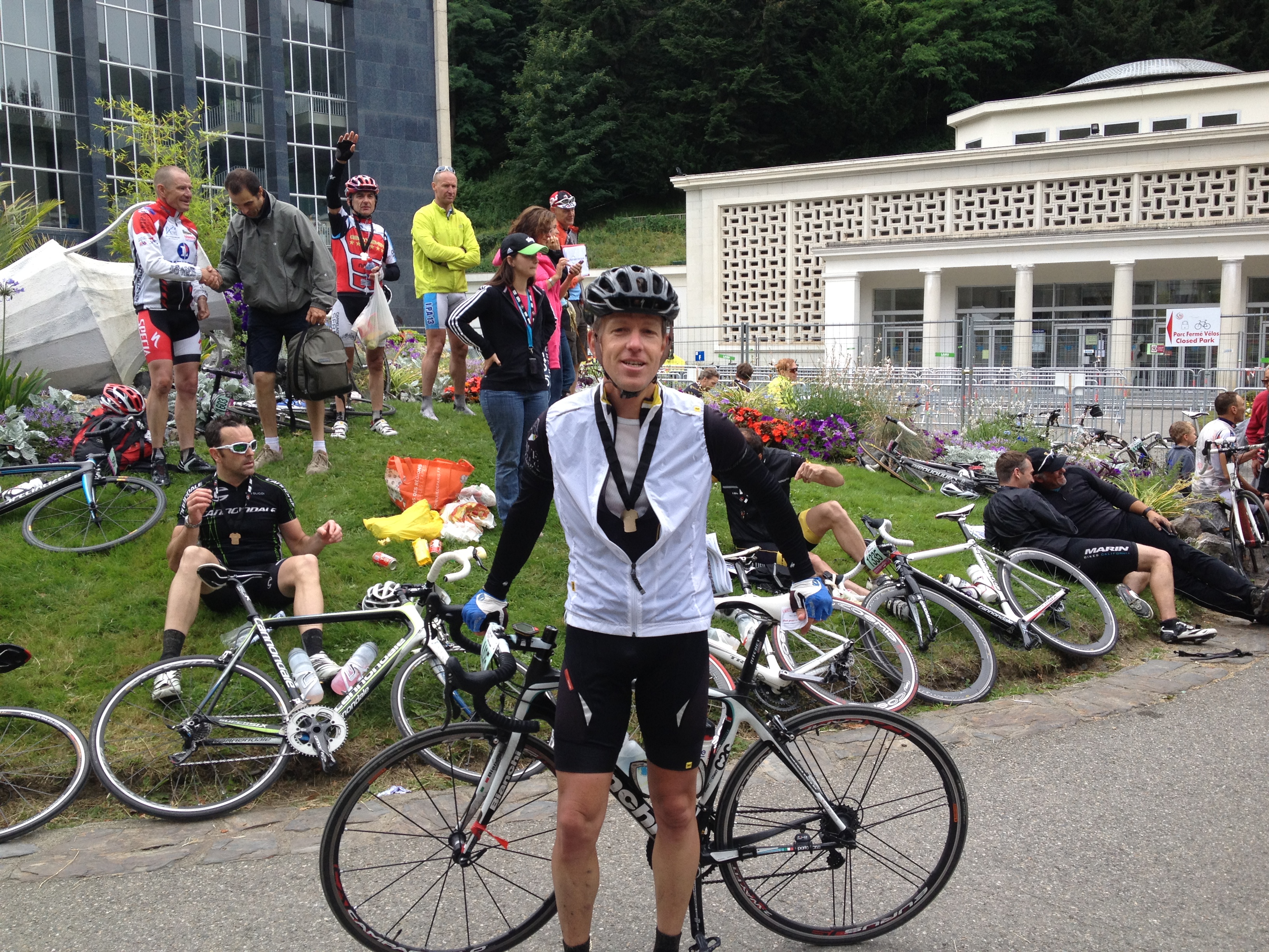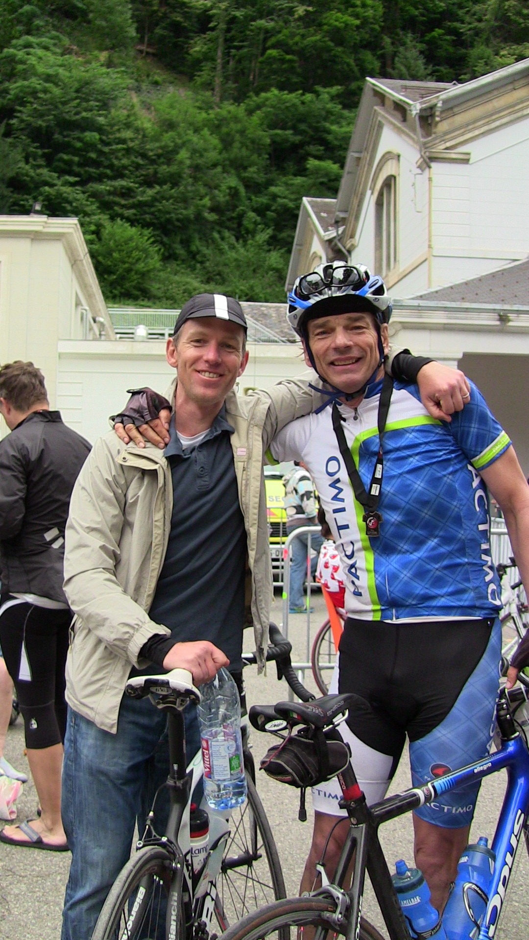 According to Rob, Peter has lost 80 pounds since last summer (36kg). You may know his story already from my blog articles, but if not, look herehere and here to get yourself up to date. Peter came all the way from Canada to live his dream of doing the Etape du Tour. He did the exact same training program as I did and stuck to it pretty religiously, from all accounts. He showed up to finish the race – probably the toughest the organizers have ever put together – and with his new wife looking on…