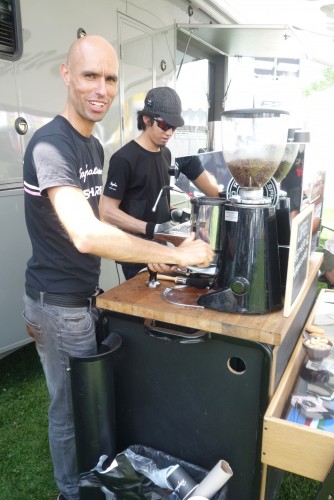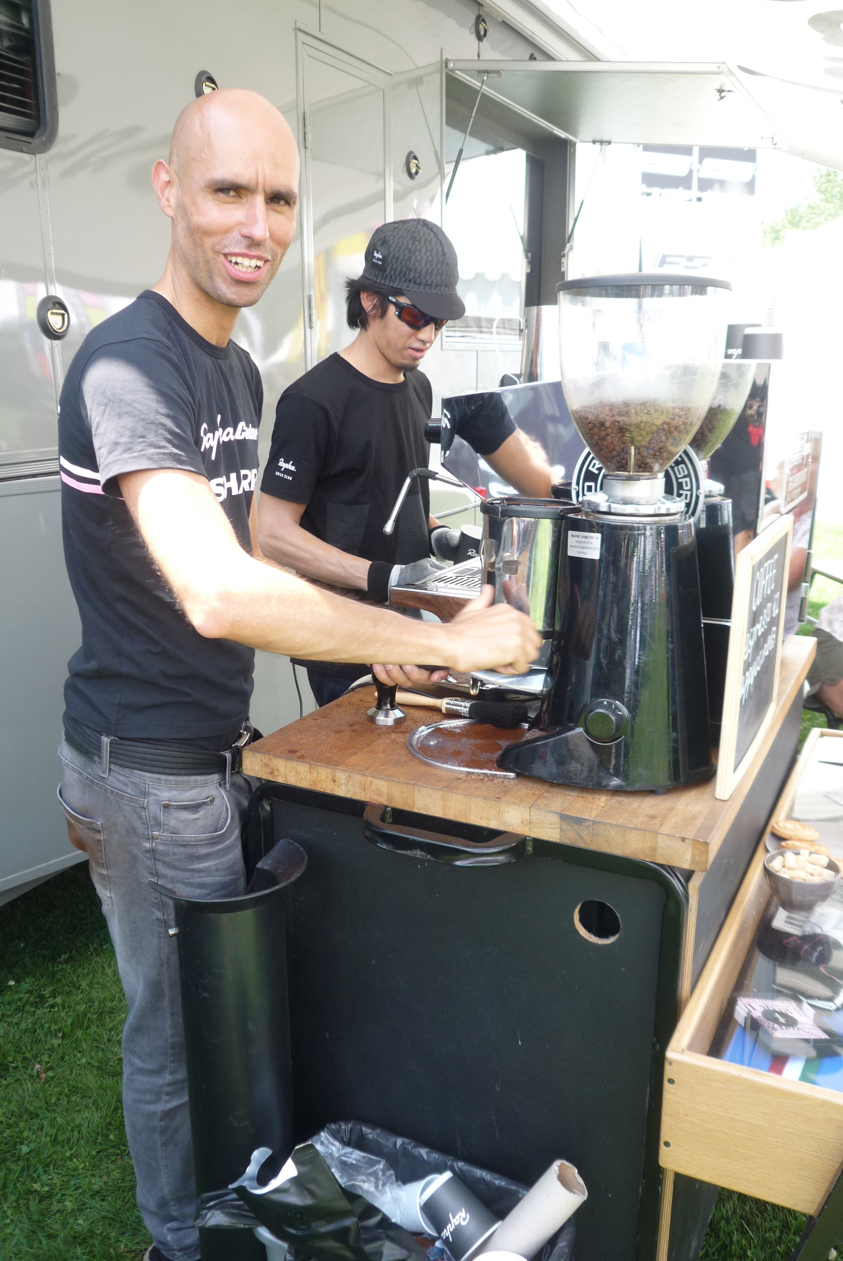 The usual suspects were present in the village: first, the tent you can’t come out of unscathed – Rapha…which I don’t seem to have a photo of. But I do have the Rapha coffee guys.