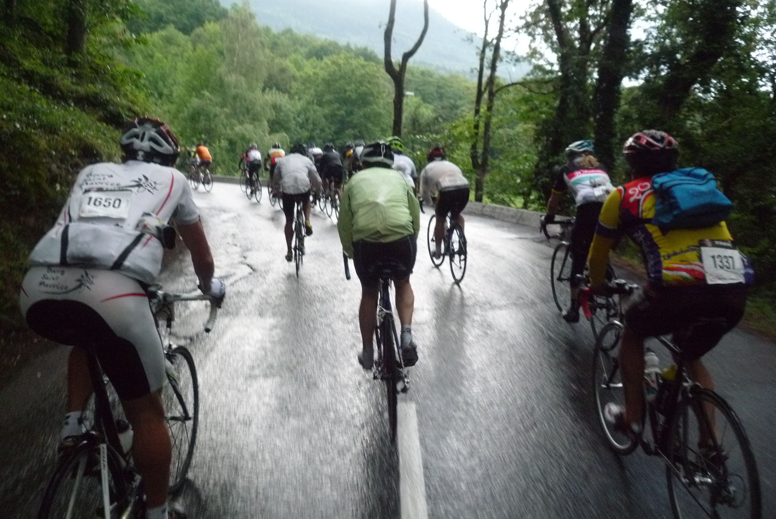 Coming, as I do, from a cold and inhospitable clime, might have benefitted me a little last Saturday. The weather, after the beginning of the first climb (Aubisque), was wet and cold. I know my wet (from Vancouver) and my cold (Quebec) pretty well and I found that I didn’t have the massive shakes I saw all around me, especially on the descents. There were cyclists actually riding with those tin foil things you wear for hypothermia at the end of the race! I’m sure it was necessary, but a metallic cape flowing behind you as you cruise down the finish line is a pretty lame look. Anyhow, I found I had plenty of energy the whole day this time and I’m not really sure if it can be chalked up to the weather, but I think it helped a bit.
