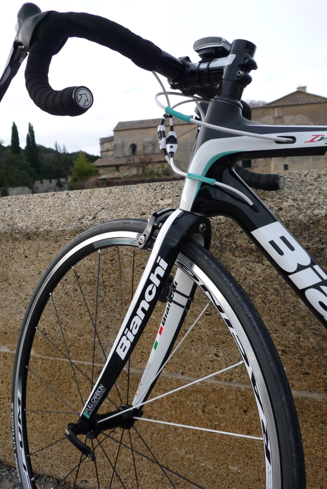 It’s a Bianchi Infinito, a bike that is marketed as a racer that is comfortable (as opposed to the Cannondale Synapse and Specialized Roubaix, which are comfortable but can be raced). The geometry is slightly more forgiving that a super-aggressive race bike and the carbon frame (especially the seat stays) is designed to absorb a lot of road vibration, theoretically giving you a smoother ride. I can attest to this because I took it out on a regular route just now and, compared to my Cannondale, I felt like I was floating on top of the road. Really impressive and made me wonder why I’d been missing this all these years! Here are a couple more shots before I dirty it up.