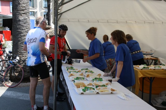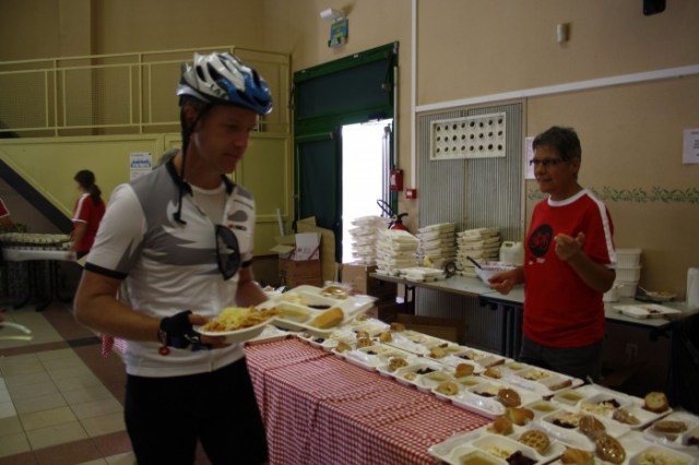 This valley had a headwind and I was looking around for a group to hide behind, when suddenly a guy flew by me on my left. I lept after him and managed to catch his wheel after some considerable effort. I’ve learned this year that it’s important to be quick in identifying good riders when they fly by and latch on before its too late. Usually I’m hopelessly too slow, but this time I got him and hung on for dear life for the next 20 km. He was an awesome descender, with beautiful lines through the corners and a vision that was a hundred meters up the road instead of just in front of his bike (I mean he knew where he wanted to go long before he got there, if that makes any sense). It was so gratifying that at the feeding station we both stopped at I had to thank him. His response: sometimes it’s good to be fat!