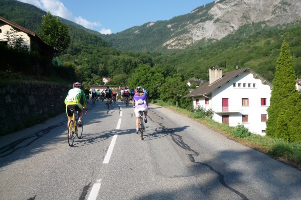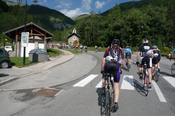The first 15 km out of Modane was a very fast (60 kph or more) slight downhill that thankfully was flat enough that we had to pedal hard to keep up the speed. This meant a good warm-up before the Col du Télégraphe began.